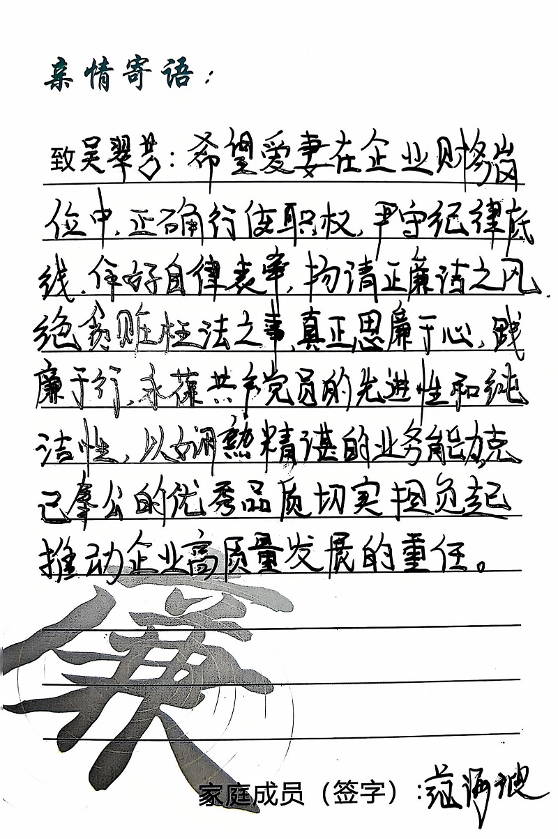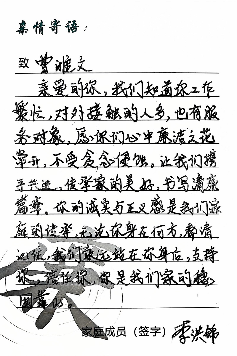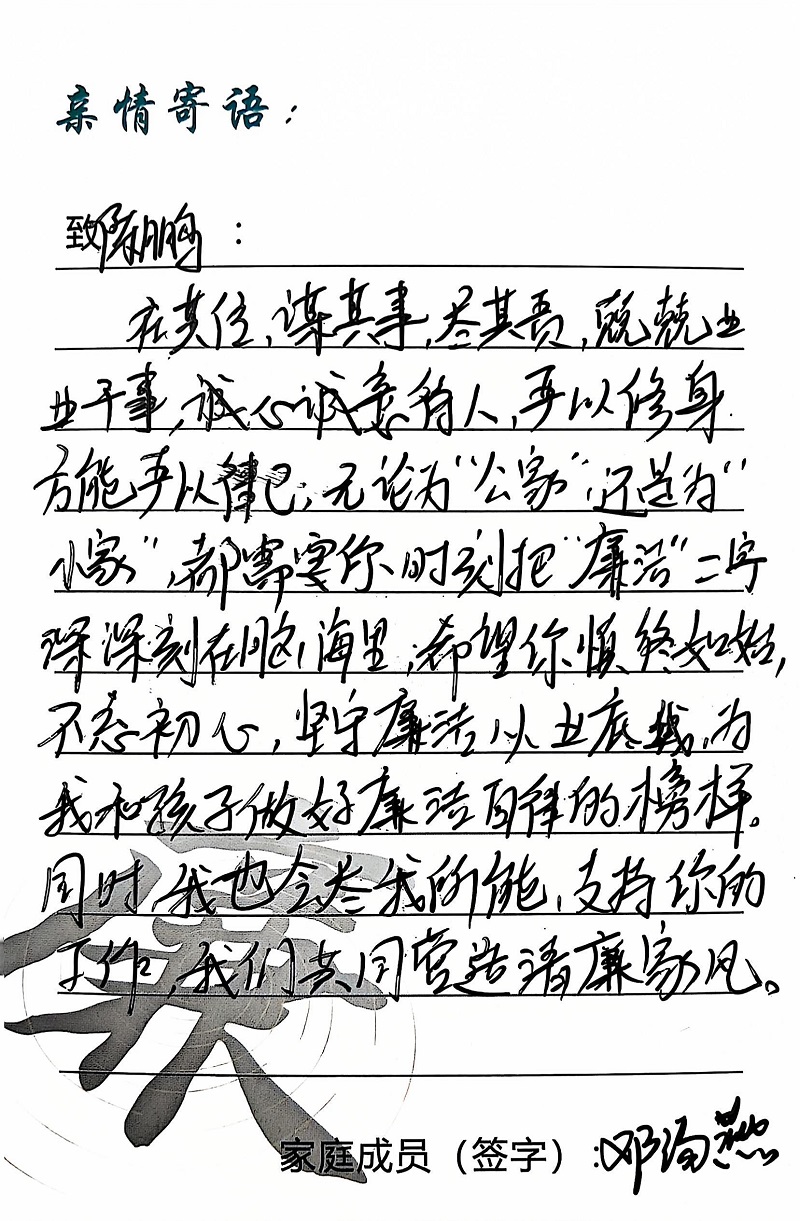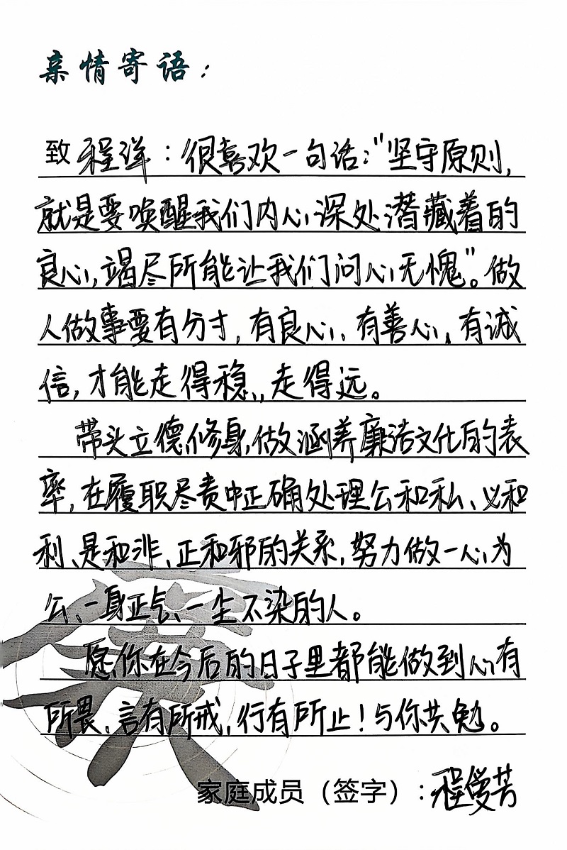 為深入學(xué)習(xí)黨的二十大精神,貫徹落實習(xí)近平總書記關(guān)于注重家庭家教家風(fēng)建設(shè)的重要論述,營造公司崇廉、尚廉、踐廉、助廉的良好氛圍,城投公司組織開展了“家滿清風(fēng)·廉潤城投”廉潔文化活動;顒娱_展以來,共征集廉政寄語210余條。經(jīng)各部門、子公司推薦,城投公司相關(guān)部門審核,評選出優(yōu)秀廉潔寄語43條,F(xiàn)將優(yōu)秀廉政寄語分批次進行展播,快來一起欣賞吧!