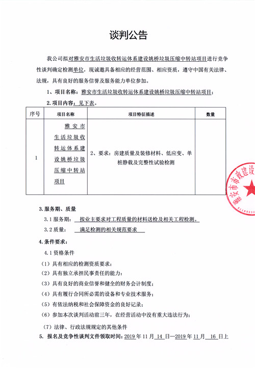 雅安市生活垃圾轉(zhuǎn)運體系建設(shè)姚橋垃圾壓縮中轉(zhuǎn)站項目競爭性談判公告