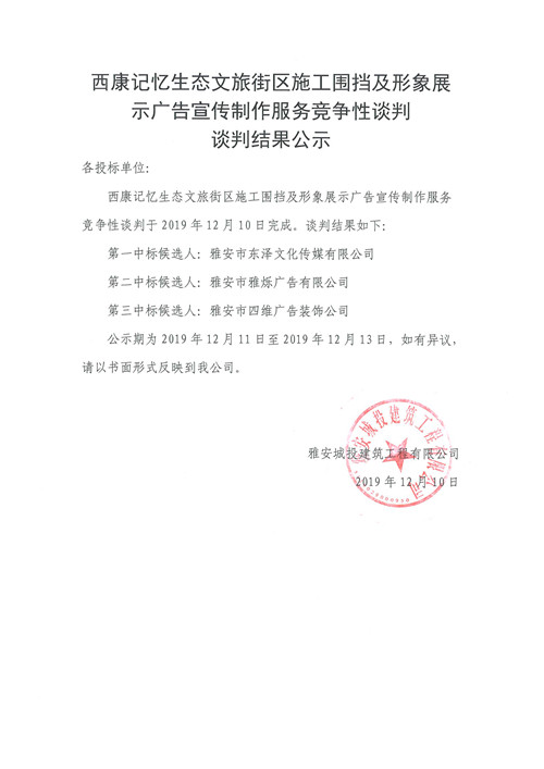 西康記憶生態(tài)文旅街區(qū)施工圍擋及形象展示廣告宣傳制作服務(wù)競爭性談判談判結(jié)果公示