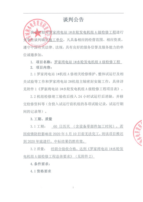 城利水電公司羅家灣電站1#水輪發(fā)電機(jī)組A級(jí)檢修工程競(jìng)爭(zhēng)性談判公告