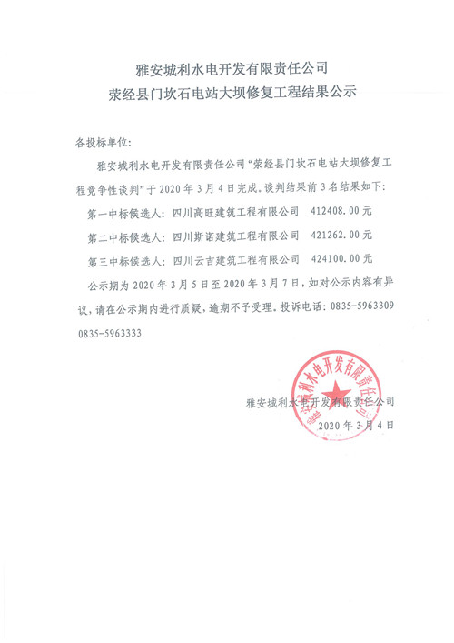 滎經(jīng)縣門(mén)坎石電站大壩修復(fù)工程結(jié)果公示