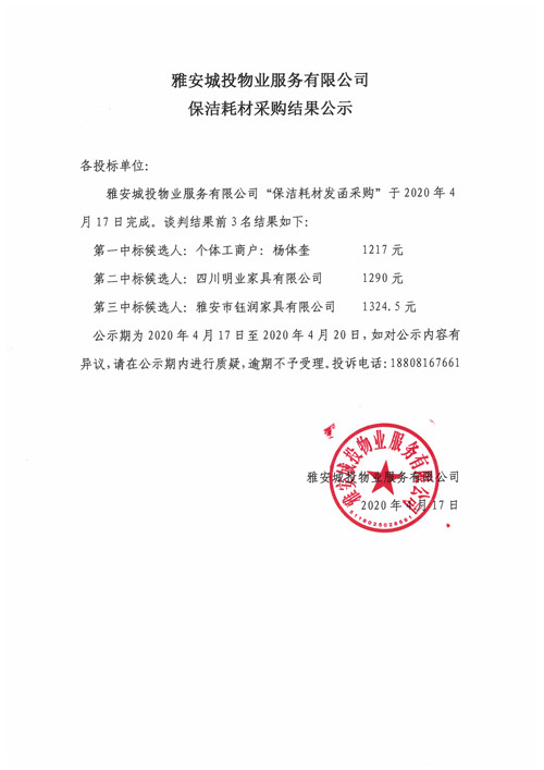 城投物業(yè)公司保潔耗材采購(gòu)結(jié)果公示