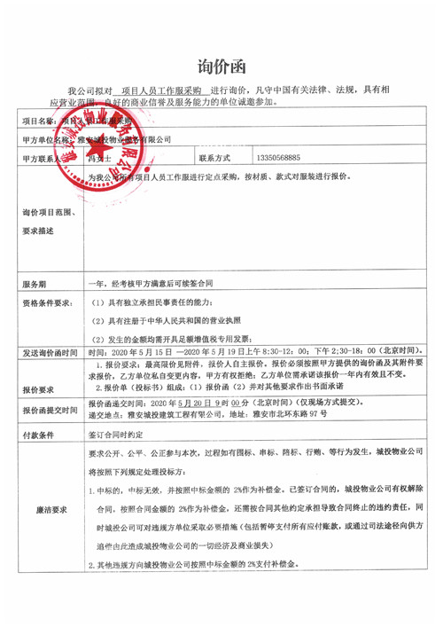 城投物業(yè)公司項(xiàng)目人員工作服采購(gòu)詢價(jià)函