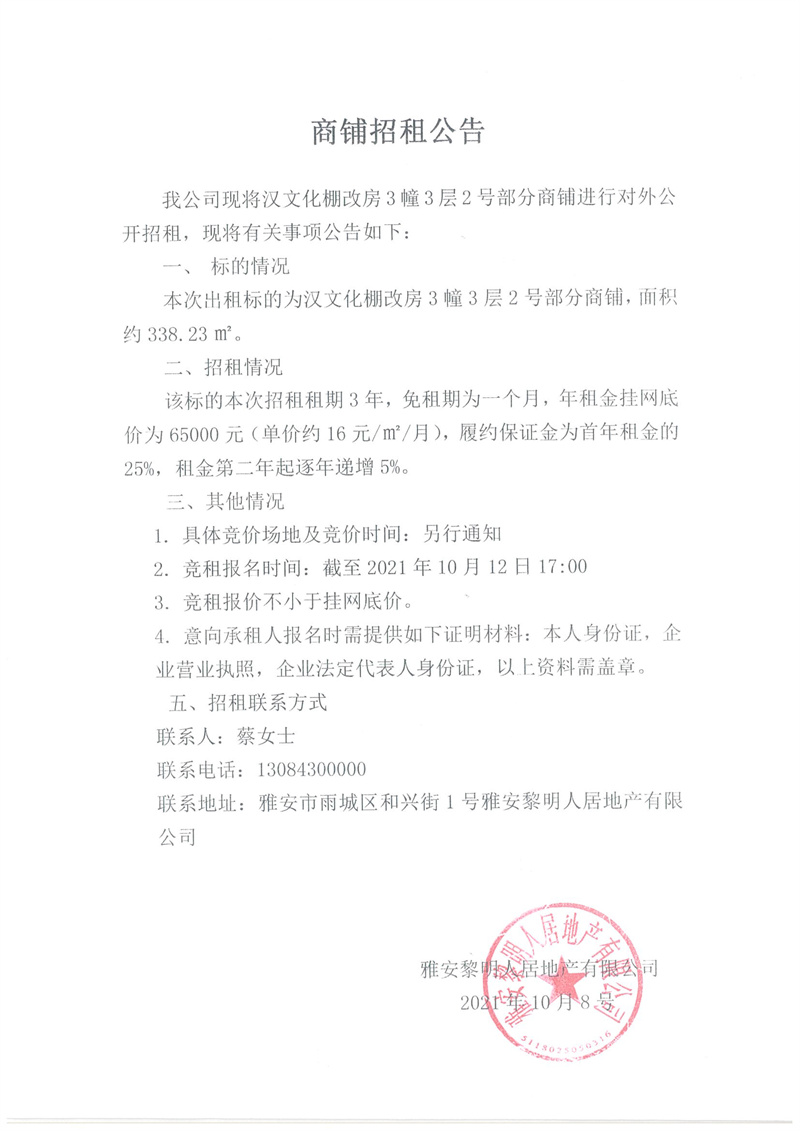 漢文化棚改房3幢3層部分商鋪招租公告