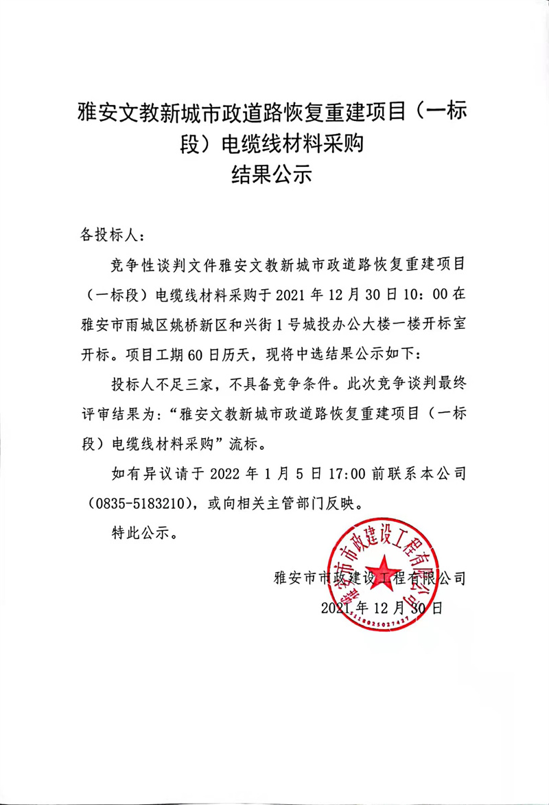 雅安文教新城市政道路恢復(fù)重建項目(一標(biāo)段)電纜線材料采購競爭性談判公告