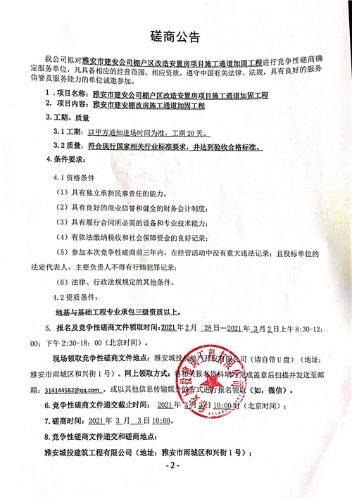 城投建工公司雅安市建安公司棚戶區(qū)改造安置房項(xiàng)目施工通道加固工程競(jìng)爭(zhēng)性磋商公告