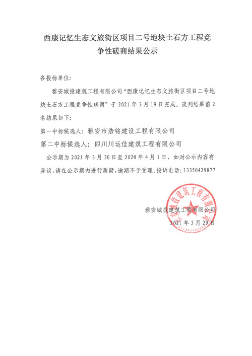 城投建工公司雅安市西康記憶生態(tài)文旅街區(qū)項目二號地塊土石方工程競爭性磋商結(jié)果公示