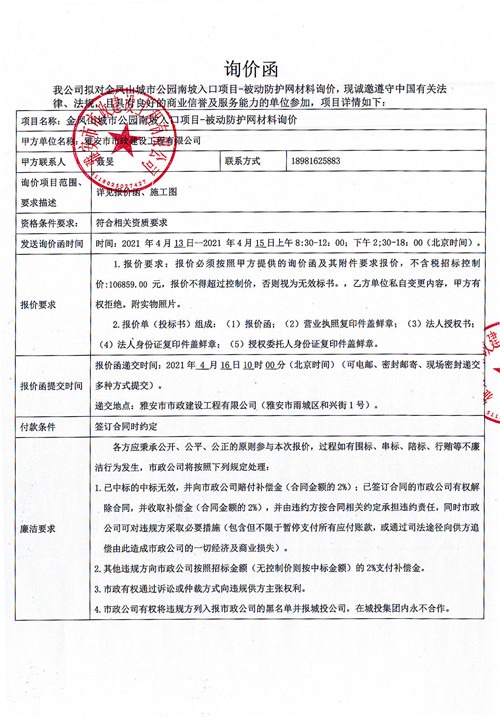 雅安市政公司金鳳山公園南坡入口項目-被動防護(hù)網(wǎng)材料詢價函