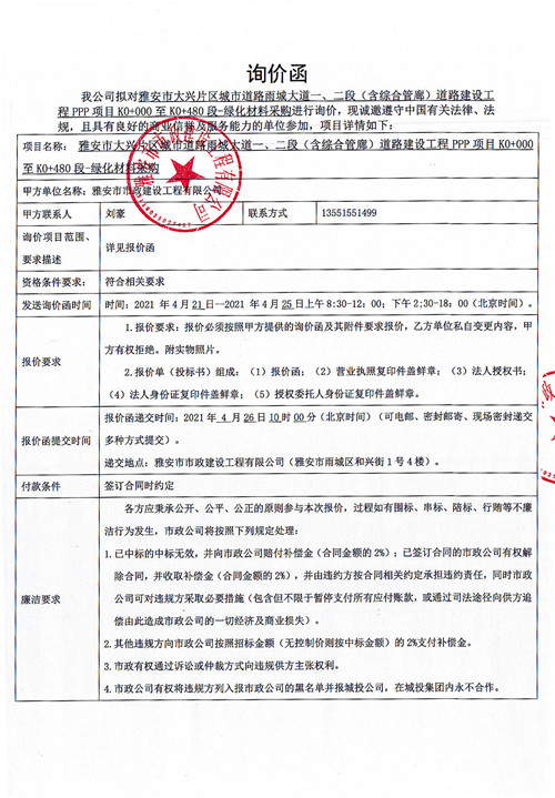 雅安市大興片區(qū)城市道路雨城大道一、二段(含綜合管廊)道路建設(shè)工程PPP項目K0+000至K0+480段-綠化材料采購詢價函