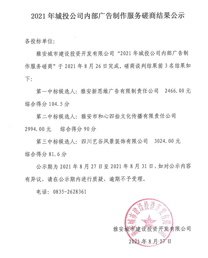 2021年城投公司內(nèi)部廣告制作服務(wù)磋商結(jié)果公示