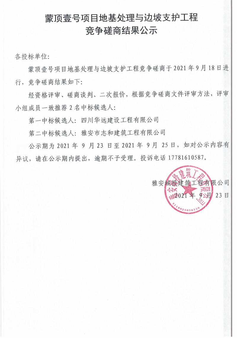 蒙頂壹號(hào)基礎(chǔ)抗浮錨桿及基坑支護(hù)工程競(jìng)爭(zhēng)磋商結(jié)果公示