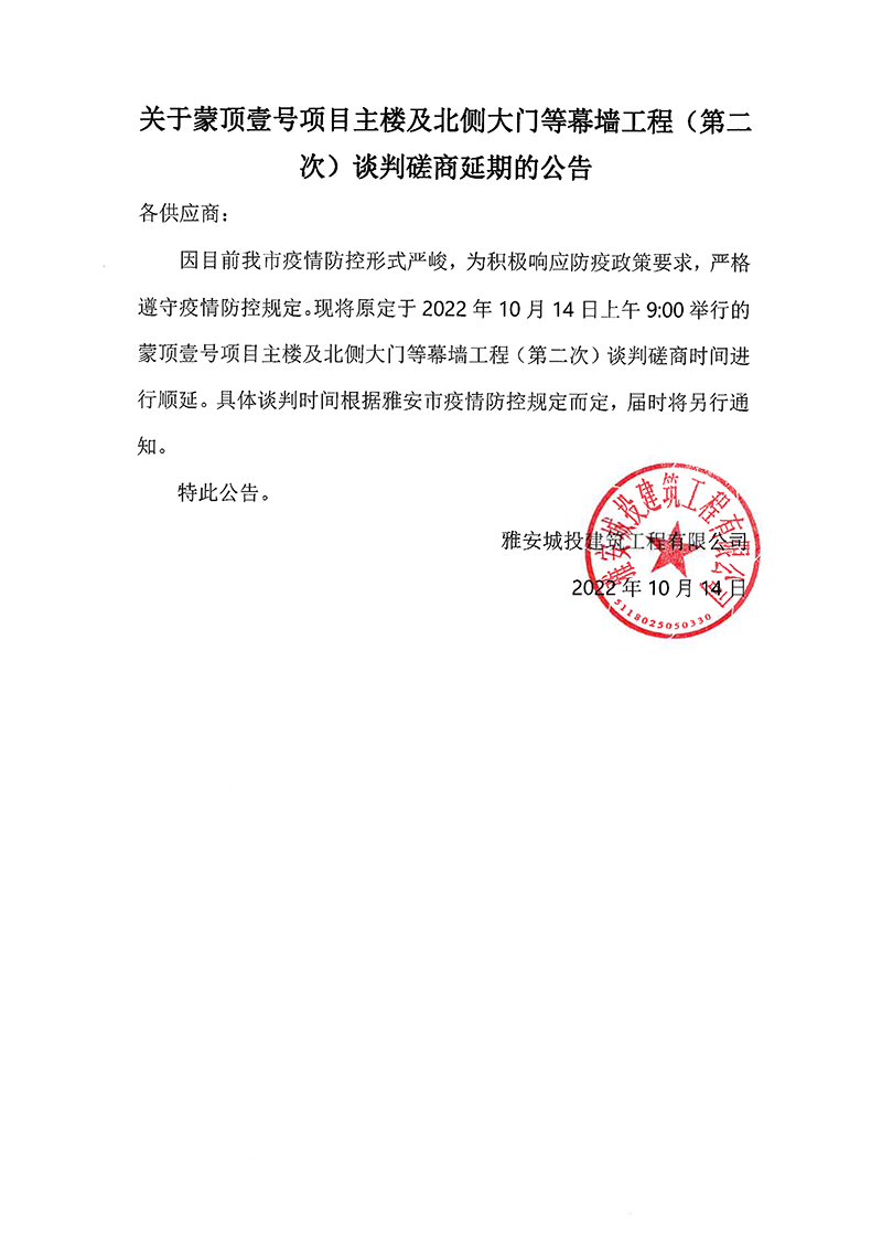 蒙頂壹號項目主樓及北側(cè)大門等幕墻工程(第二次)談判磋商延期的公告