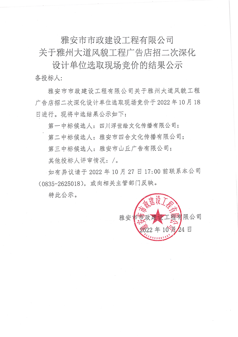 雅安市市政建設(shè)工程有限公司關(guān)于雅州大道風(fēng)貌工程廣告店招二次深化設(shè)計(jì)單位選取現(xiàn)場(chǎng)競(jìng)價(jià)的結(jié)果公示