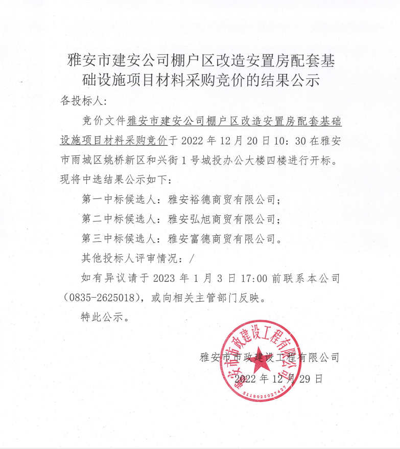 雅安市建安公司棚戶區(qū)改造安置房配套基礎(chǔ)設(shè)施項(xiàng)目材料采購競(jìng)價(jià)結(jié)果公示