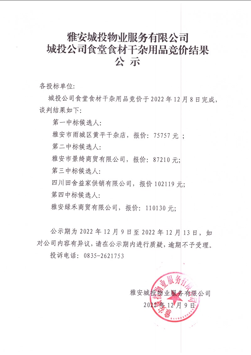雅安城投物業(yè)服務(wù)有限公司城投公司食堂干雜競(jìng)價(jià)結(jié)果公示