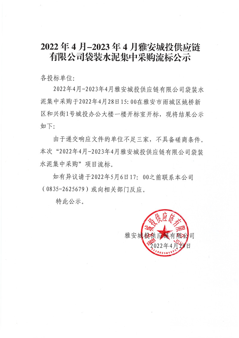 2022年4月-2023年4月雅安城投供應(yīng)鏈有限公司袋裝水泥集中采購流標公示