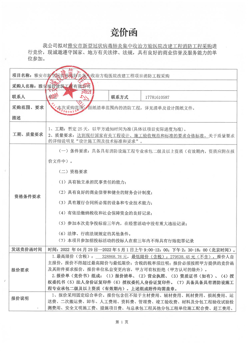 雅安市新型冠狀病毒肺炎集中收治方艙醫(yī)院改建工程項(xiàng)目消防工程采購競價(jià)公告