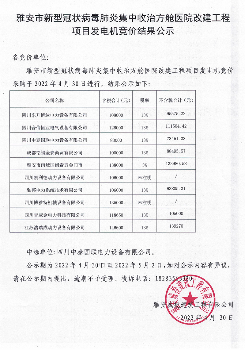 雅安市新型冠狀病毒肺炎集中收治方艙醫(yī)院改建工程項目發(fā)電機(jī)競價結(jié)果公示