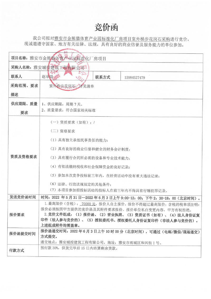 雅安市金熊貓?bào)w育產(chǎn)業(yè)園標(biāo)準(zhǔn)化廠房項(xiàng)目室外梯步花崗石采購競(jìng)價(jià)函