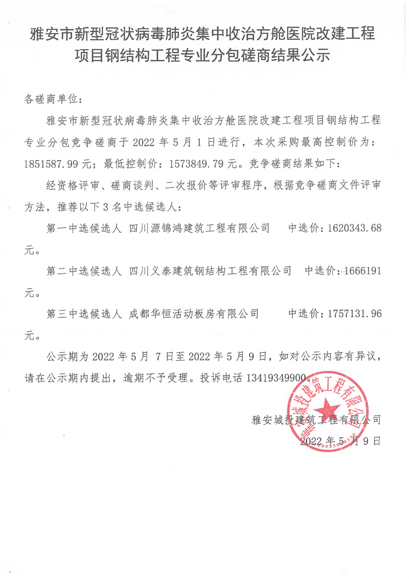 雅安市新型冠狀病毒肺炎集中收治方艙醫(yī)院改建工程項(xiàng)目鋼結(jié)構(gòu)工程專業(yè)分包磋商結(jié)果公示