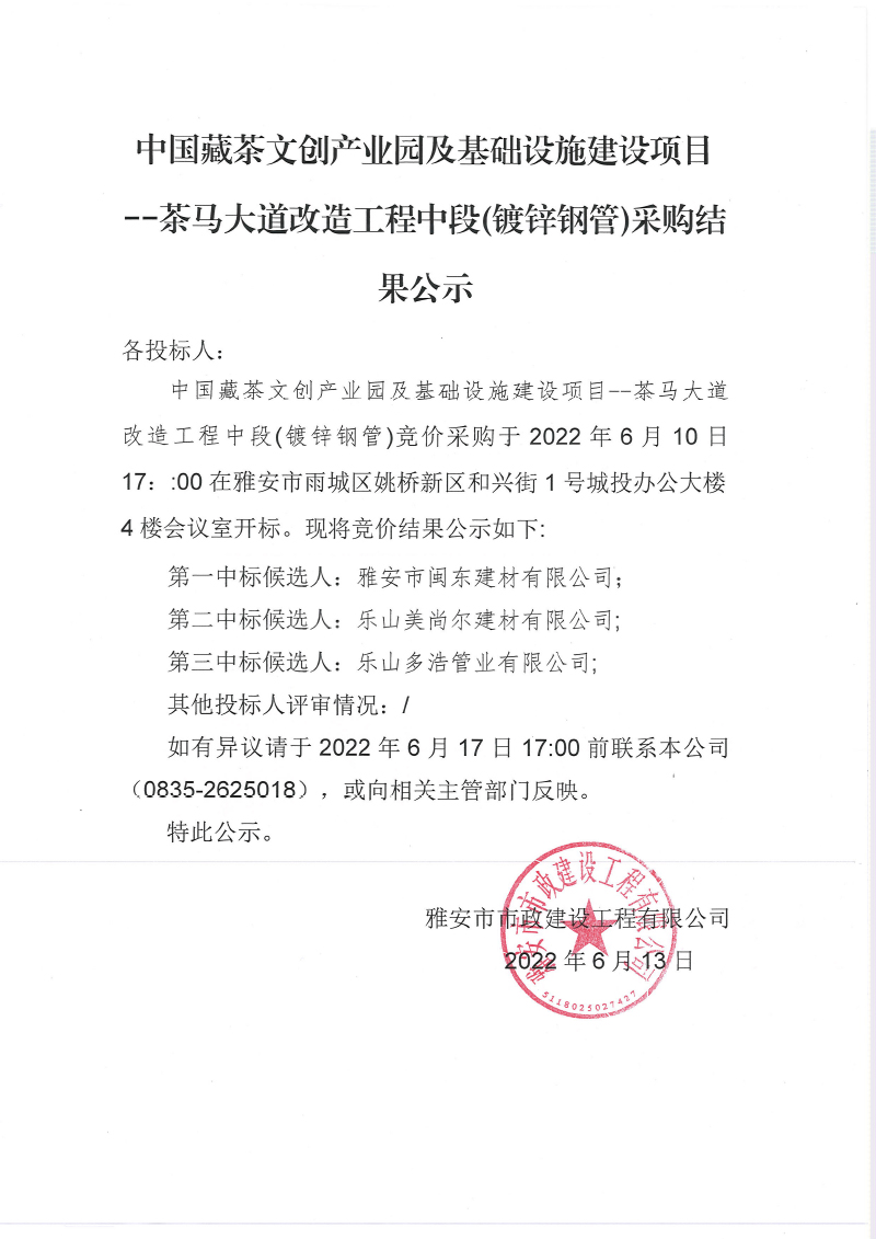 中國藏茶文創(chuàng)產(chǎn)業(yè)園及基礎(chǔ)設(shè)施建設(shè)項 茶馬大道改造工程中段鍍鋅鋼管采購結(jié)果公示