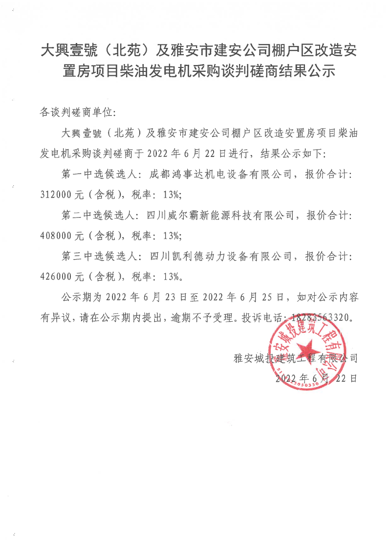 大興壹號(hào)(北苑)及雅安市建安公司棚戶區(qū)改造安置房項(xiàng)目柴油發(fā)電機(jī)采購談判磋商結(jié)果公示