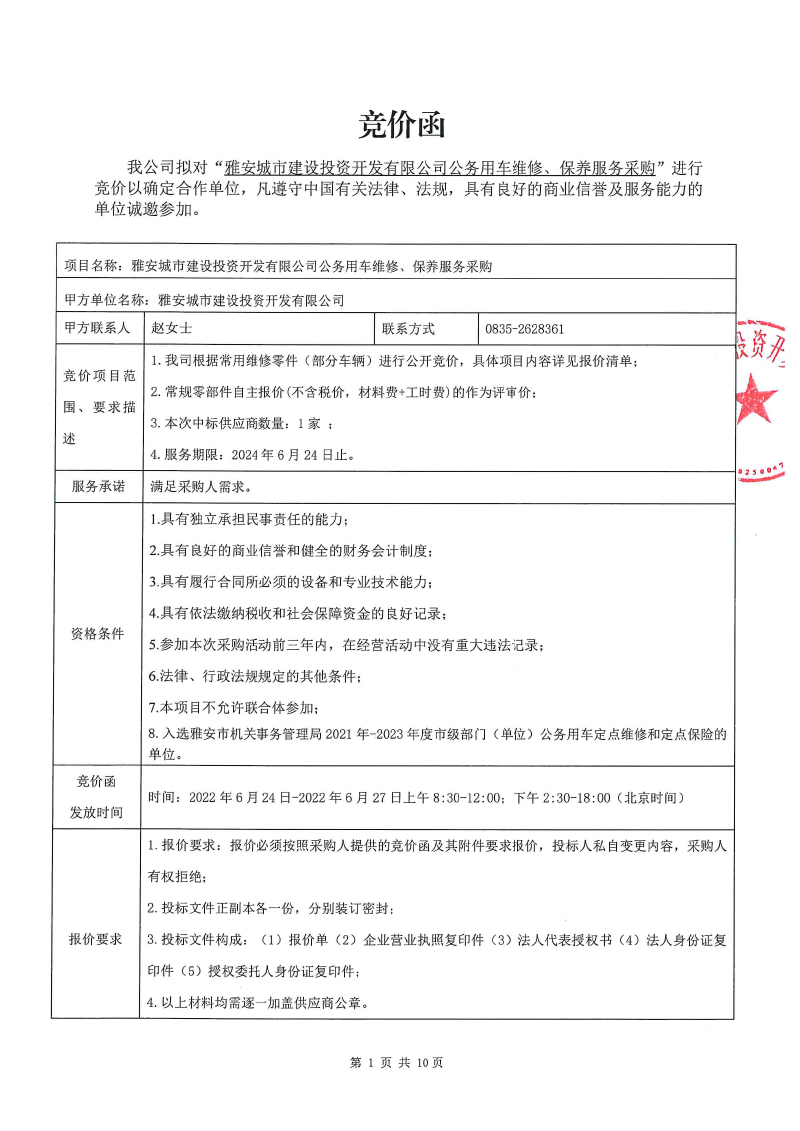 雅安城市建設(shè)投資開發(fā)有限公司 公務(wù)用車維修、保養(yǎng)服務(wù)采購項(xiàng)目競(jìng)價(jià)公告