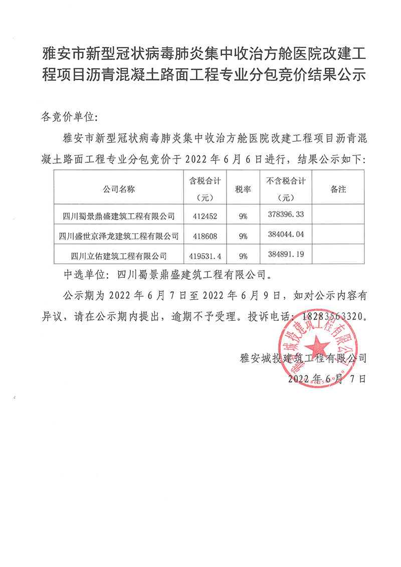 雅安市新型冠狀病毒肺炎集中收治方艙醫(yī)院改建工程項(xiàng)目瀝青混凝土路面工程專(zhuān)業(yè)分包競(jìng)價(jià)結(jié)果公示