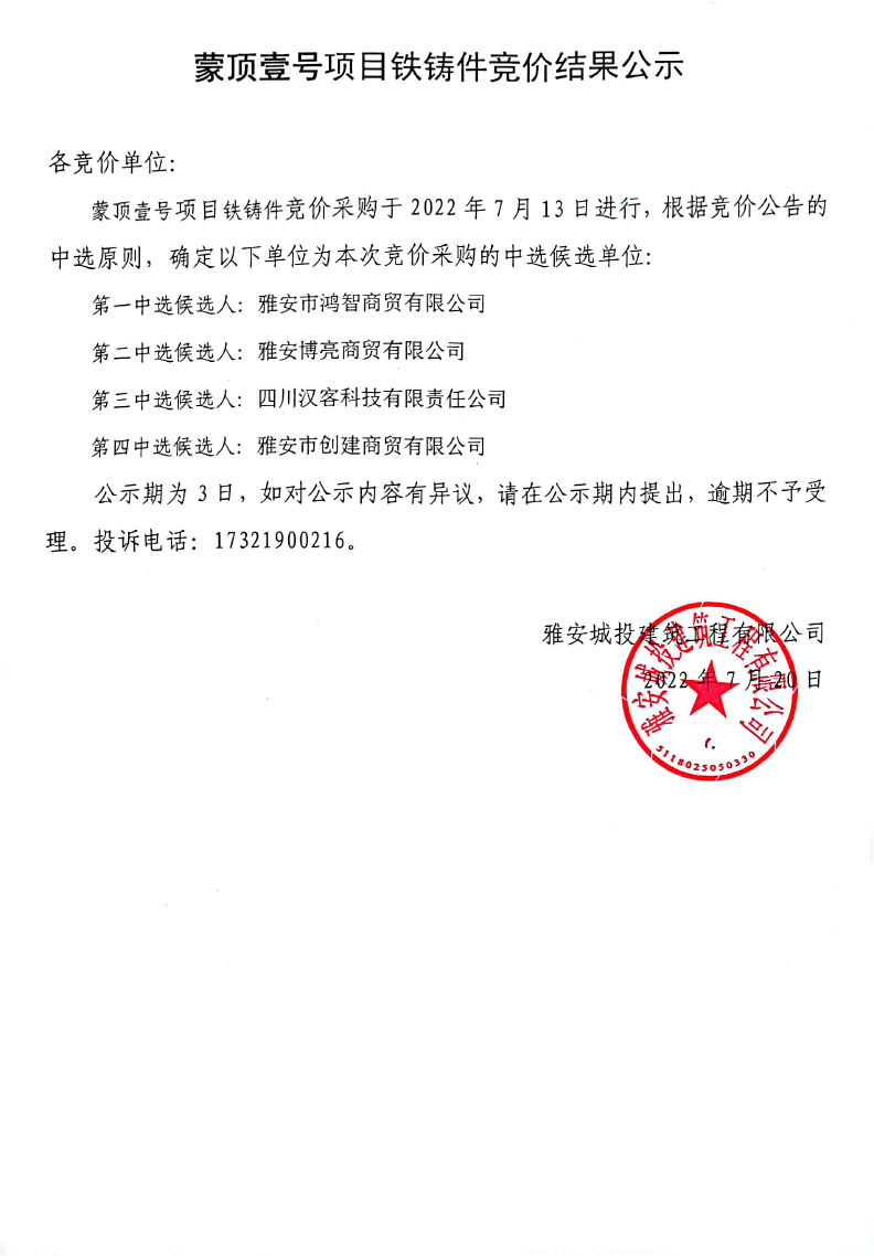 蒙頂壹號項目鐵鑄件競價結(jié)果公示