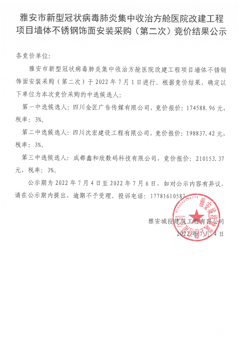 雅安市新型冠狀病毒肺炎集中收治方艙醫(yī)院改建工程項(xiàng)目墻體不銹鋼飾面安裝采購(第二次)競(jìng)價(jià)結(jié)果公示