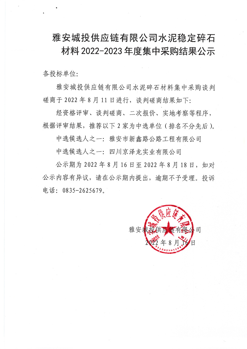 雅安城投供應鏈有限公司水泥穩(wěn)定碎石材料2022-2023年度集中采購結(jié)果公示