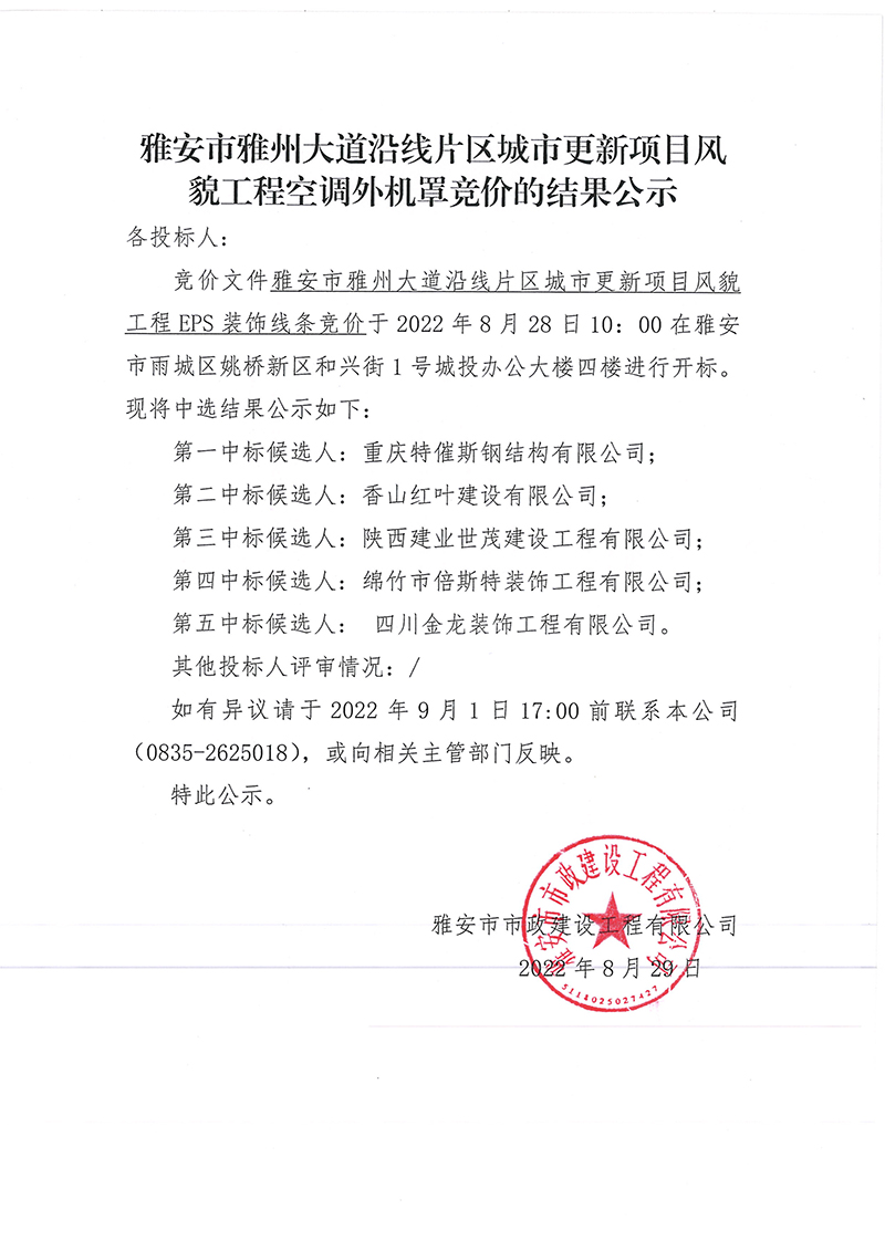 雅安市雅州大道沿線片區(qū)城市更新項(xiàng)目風(fēng)貌工程空調(diào)外機(jī)罩競價(jià)的結(jié)果公示