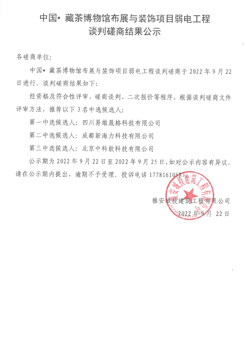 中國• 藏茶博物館布展與裝飾項(xiàng)目弱電工程談判磋商結(jié)果公示