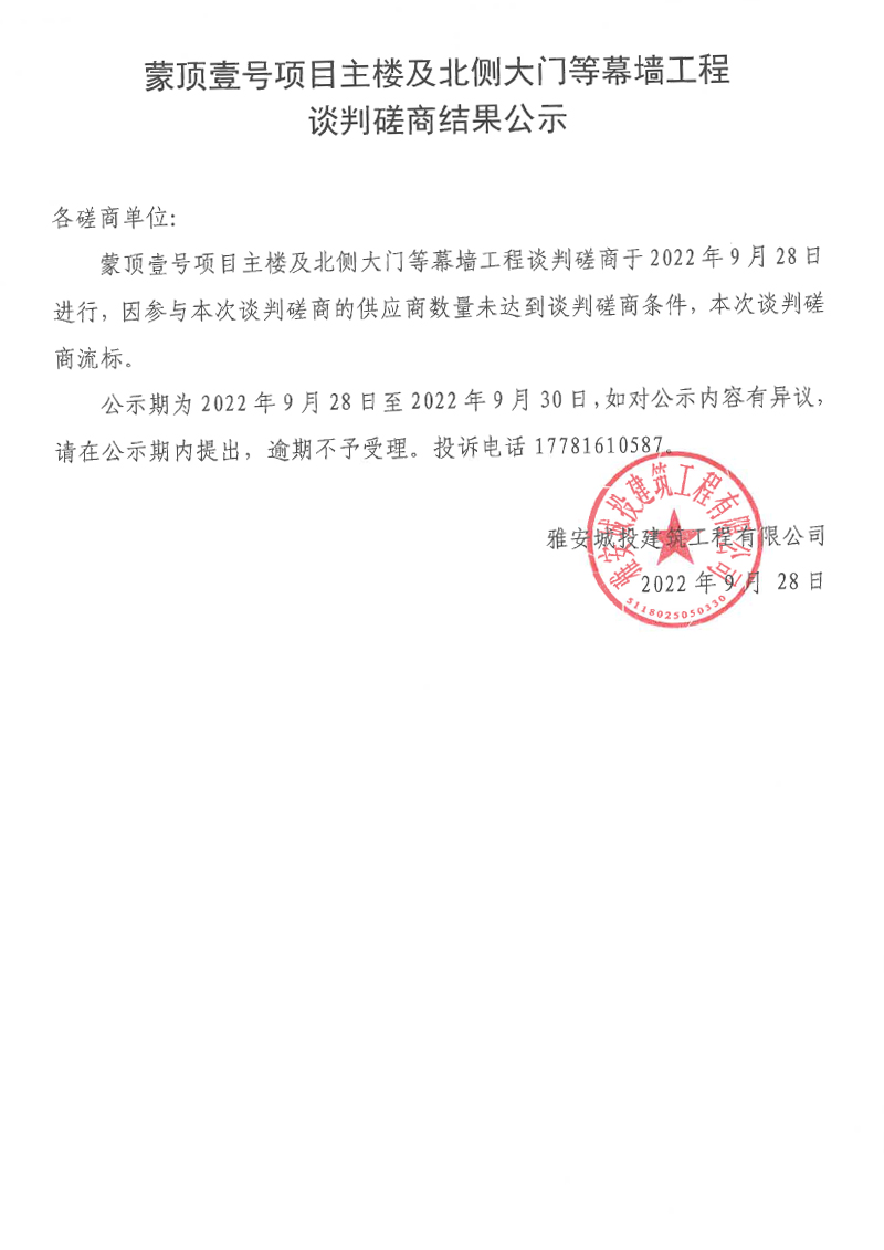 蒙頂壹號項目主樓及北側(cè)大門等幕墻工程談判磋商結(jié)果公示