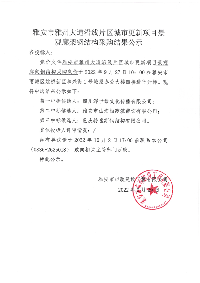 雅安市雅州大道沿線片區(qū)城市更新項(xiàng)目景觀廊架鋼結(jié)構(gòu)采購結(jié)果公示