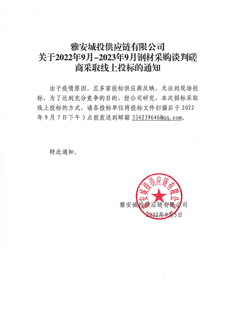 雅安城投供應(yīng)鏈有限公司關(guān)于2022年9月-2023年9月鋼材采購談判磋商采取線上投標(biāo)的通知