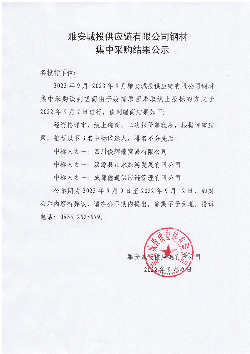 雅安城投供應(yīng)鏈有限公司鋼材集中采購(gòu)結(jié)果公示
