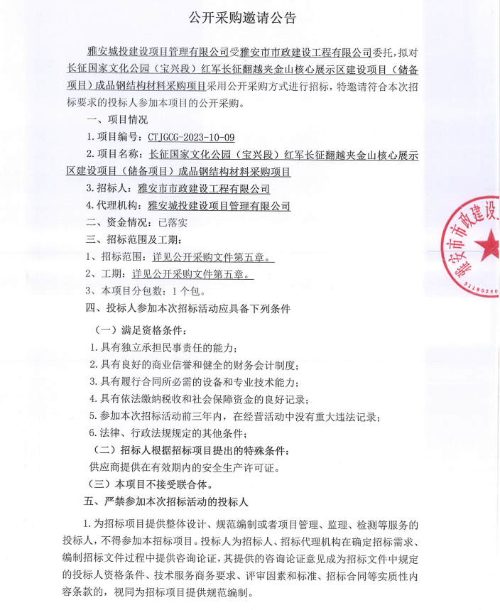 長征國家文化公園(寶興段)紅軍長征翻越夾金山核心展示區(qū)建設(shè)項(xiàng)目(儲備項(xiàng)目)成品鋼結(jié)構(gòu)材料采購項(xiàng)目公開采購邀請公告