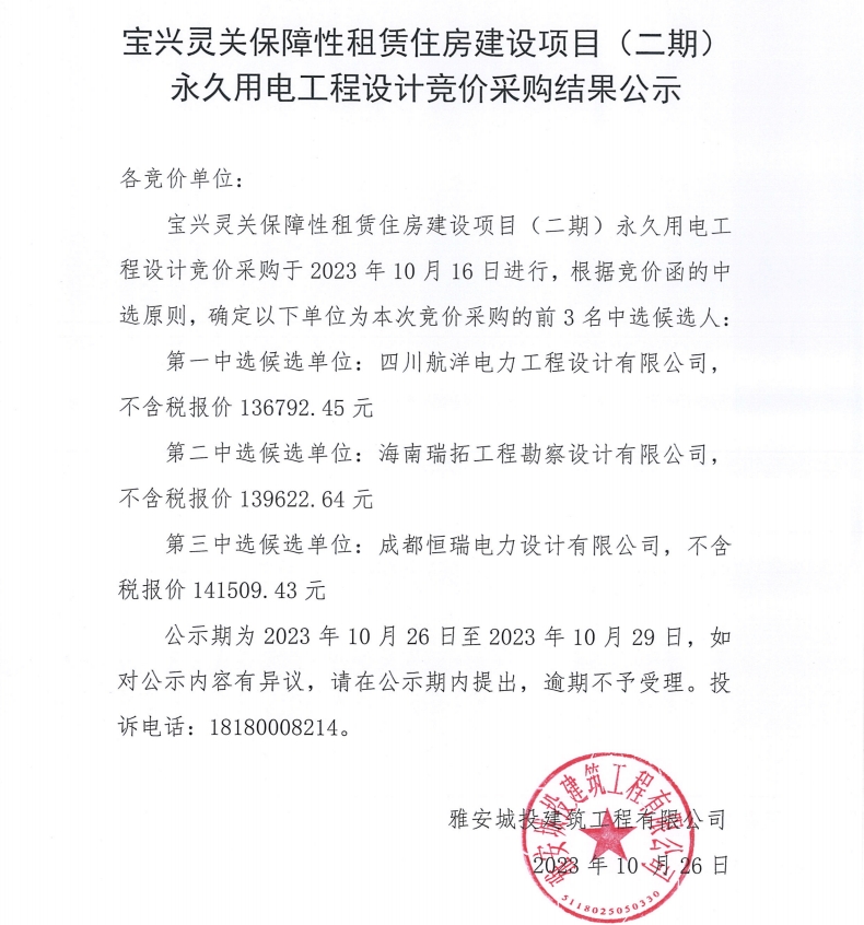 寶興靈關(guān)保障性租賃住房建設(shè)項目(二期)永久用電工程設(shè)計競價采購結(jié)果公示