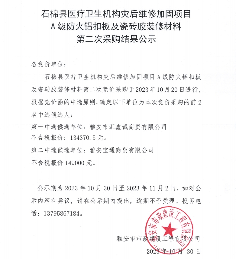 石棉縣醫(yī)療衛(wèi)生機(jī)構(gòu)災(zāi)后維修加固項(xiàng)目A級(jí)防火鋁扣板及瓷磚膠裝修材料第二次采購(gòu)結(jié)果公示