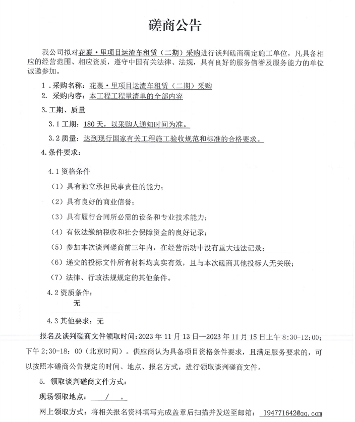 花襄·里項(xiàng)目運(yùn)渣車租賃(二期)采購(gòu)談判磋商公告
