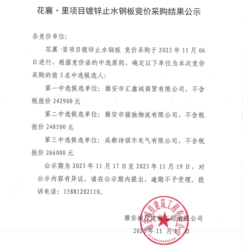 花襄·里項目鍍鋅止水鋼板競價采購結(jié)果公示
