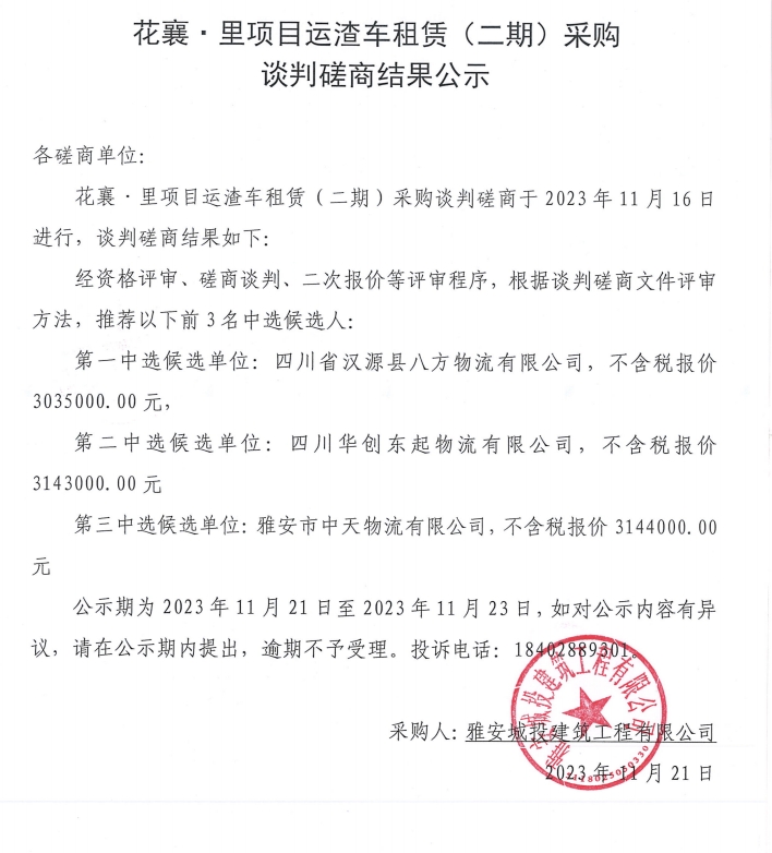 花襄·里項(xiàng)目運(yùn)渣車(chē)租賃(二期)采購(gòu)談判磋商結(jié)果公示