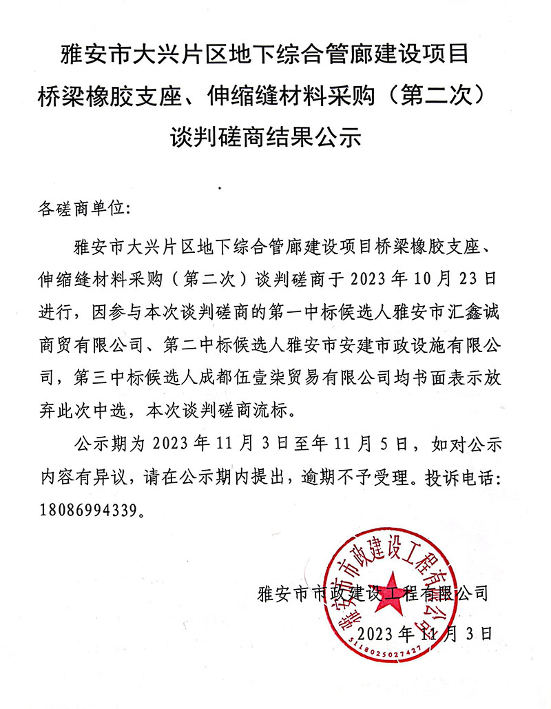 雅安市大興片區(qū)地下綜合管廊建設(shè)項(xiàng)目橋梁橡膠支座、伸縮縫材料采購(gòu)(第二次)談判磋商結(jié)果公示