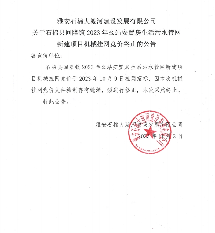 雅安石棉大渡河建設發(fā)展有限公司關于石棉縣回隆鎮(zhèn)2023年幺站安置房生活污水管網新建項目機械掛網競價終止的公告