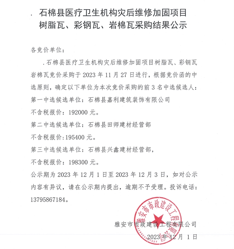 石棉縣醫(yī)療衛(wèi)生機(jī)構(gòu)災(zāi)后維修加固項(xiàng)目樹脂瓦、彩鋼瓦、巖棉瓦采購結(jié)果公示