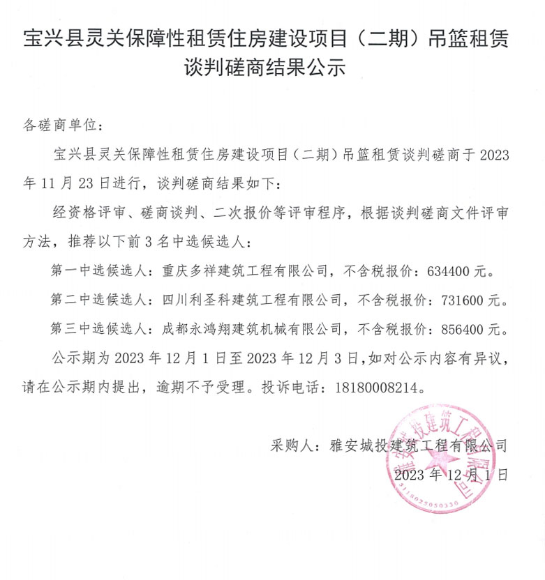 寶興縣靈關(guān)保障性租賃住房建設(shè)項目(二期)吊籃租賃談判磋商結(jié)果公示