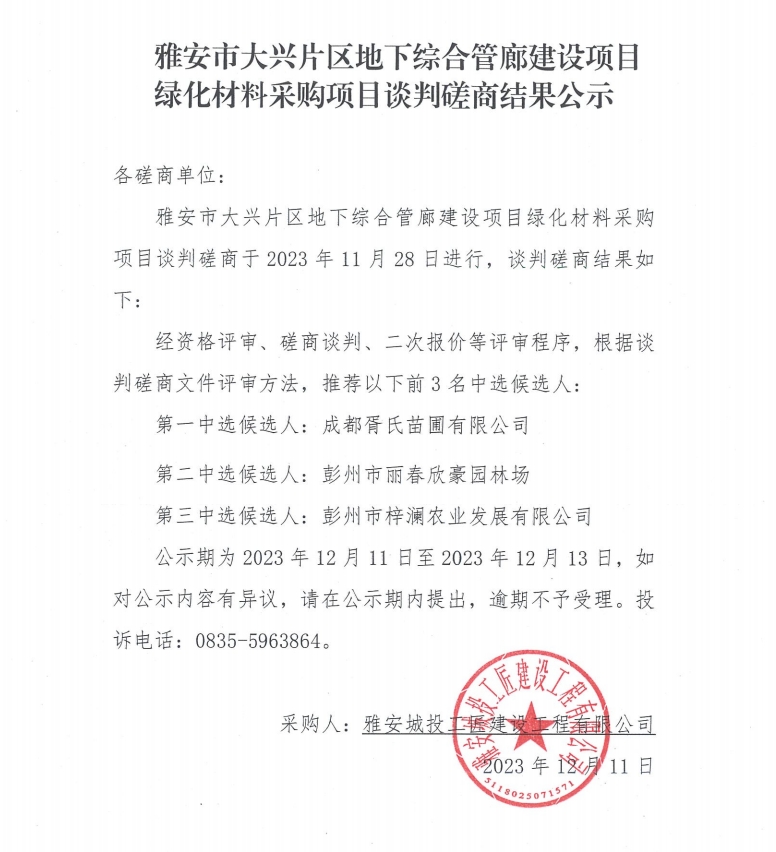 雅安市大興片區(qū)地下綜合管廊建設(shè)項(xiàng)目綠化材料采購(gòu)項(xiàng)目談判磋商結(jié)果公示