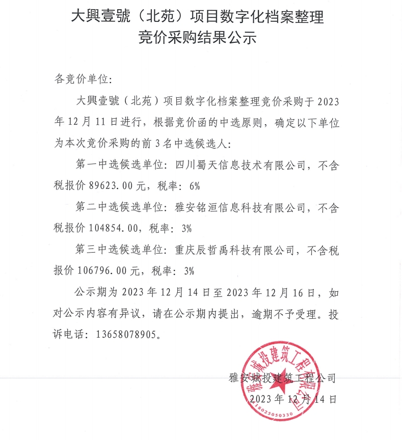 大興壹號(hào)(北苑)項(xiàng)目數(shù)字化檔案整理競(jìng)價(jià)采購(gòu)結(jié)果公示