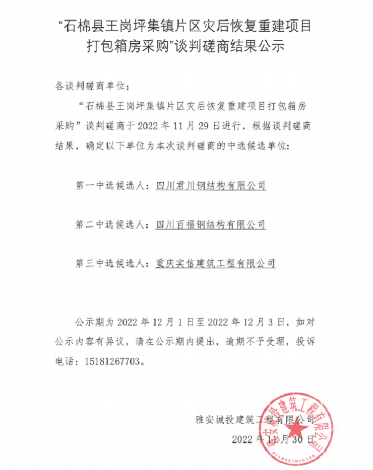 “石棉縣王崗坪集鎮(zhèn)片區(qū)災后恢復·重建項目打包箱房采購”談判磋商結果公示